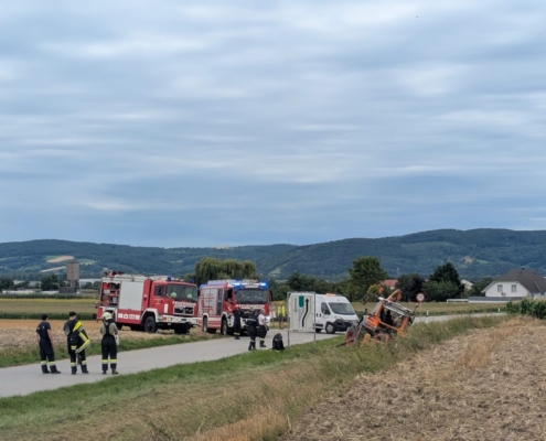 Am 23. Juli wurde die Feuerwehr Leobendorf um 10:07 Uhr zu einer Traktorbergung nach der Ortsausfahrt Richtung Tresdorf alarmiert.Im Zuge von Mäharbeiten kam ein Traktor in gefährliche Schieflage und drohte umzustürzen.Mittels zweier Seilwinden befreiten wir das Fahrzeug aus seiner misslichen Lage.