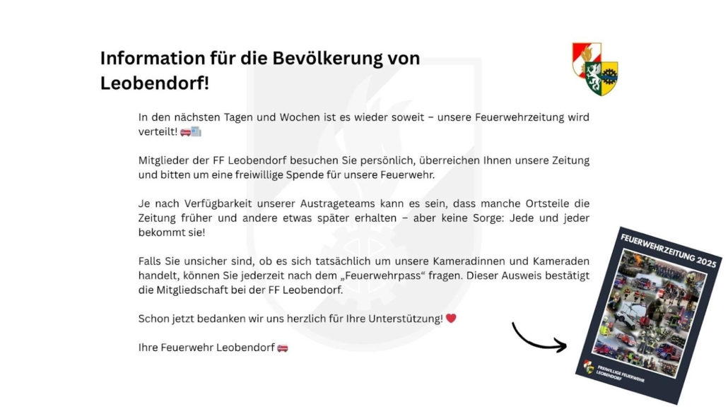 Die FF Leobendorf möchte Sie über die Beendigung des Austragens der FF Zeitung informieren.