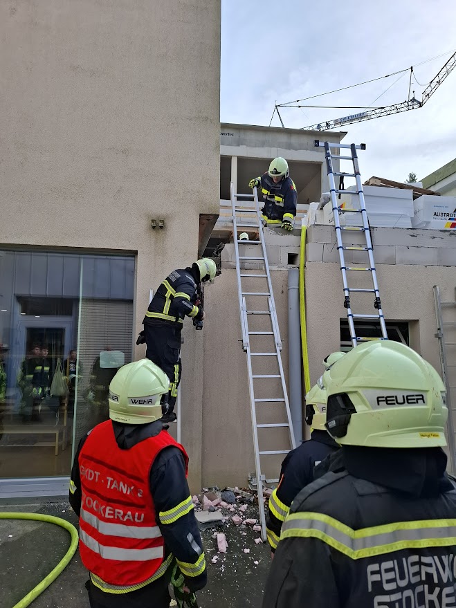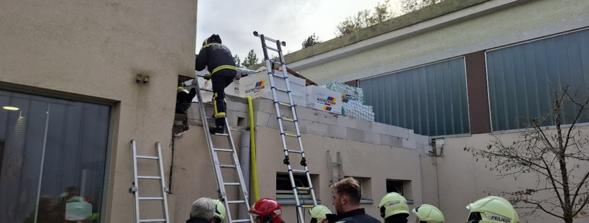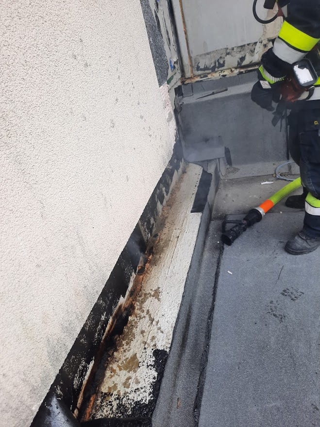 In Zusammenarbeit mit der ebenfalls alarmierten Feuerwehr Stockerau entfernten wir Teile der betroffenen Fassade und die Bitumendachbahn.