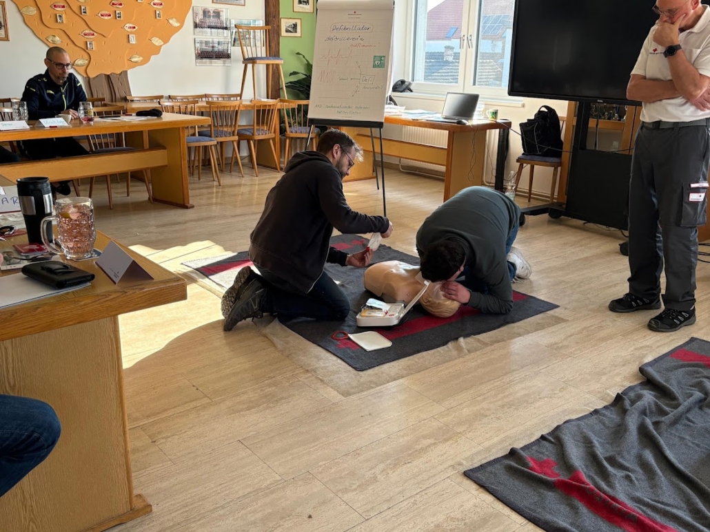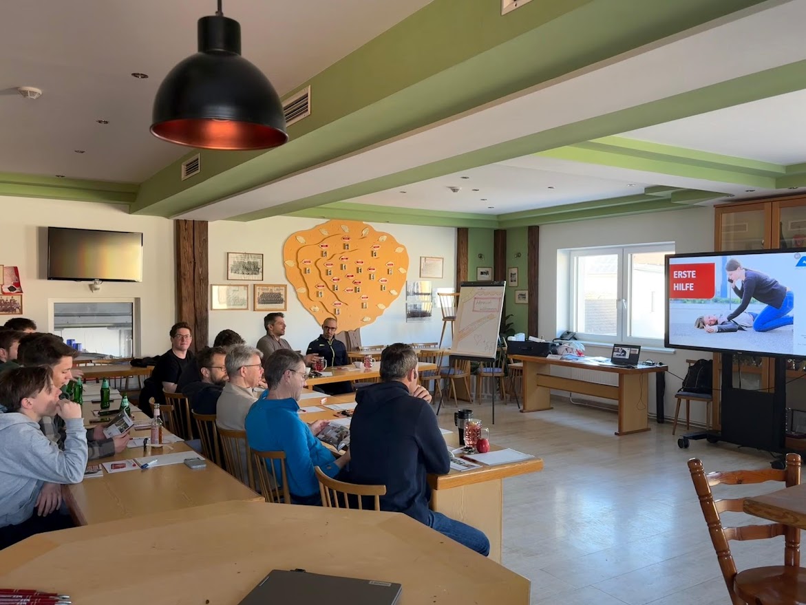 Im Laufe des Tages wurden sowohl theoretische Grundlagen als auch praktische Maßnahmen intensiv behandelt. Dazu zählten unter anderem das richtige Verhalten am Einsatzort, die stabile Seitenlage, Wiederbelebungsmaßnahmen sowie der Umgang mit dem Defibrillator. Auch das Versorgen von Verletzungen und das richtige Vorgehen bei Notfällen wurde praxisnah geübt. Durch zahlreiche Fallbeispiele und praktische Übungen konnten die Kameraden ihr Wissen direkt anwenden und festigen.