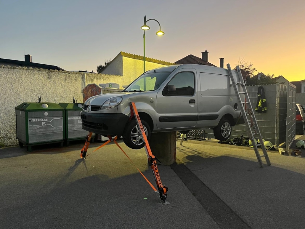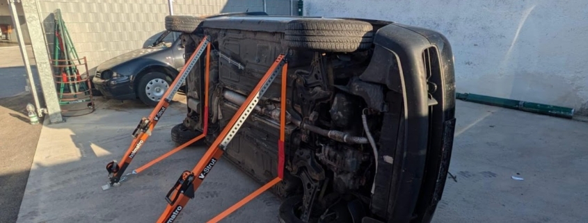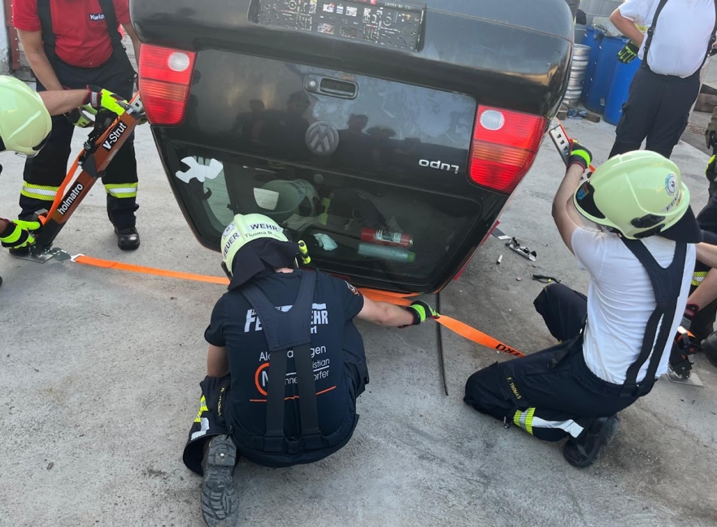 Das Abstützen von verunfallten Fahrzeugen in Dach- oder Seitenlage, die Rettung eines eingeklemmten Rollerfahrers unter einem PKW sowie „Auto auf dem heißen Stein“ boten realitätsnahe Szenarien, um die Handhabung der Geräte zu verstehen und sicher zu beherrschen.