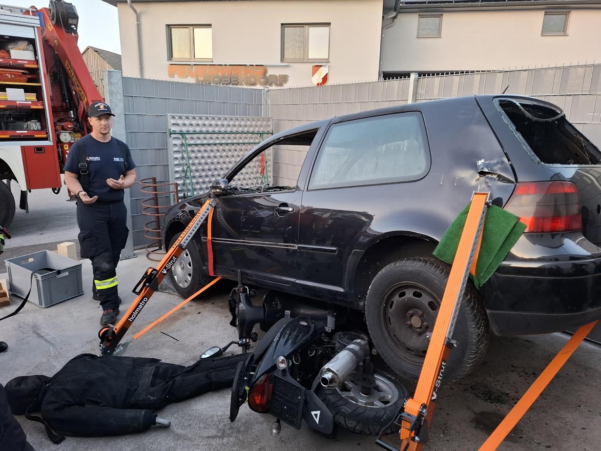 Das Abstützen von verunfallten Fahrzeugen in Dach- oder Seitenlage, die Rettung eines eingeklemmten Rollerfahrers unter einem PKW sowie „Auto auf dem heißen Stein“ boten realitätsnahe Szenarien, um die Handhabung der Geräte zu verstehen und sicher zu beherrschen.