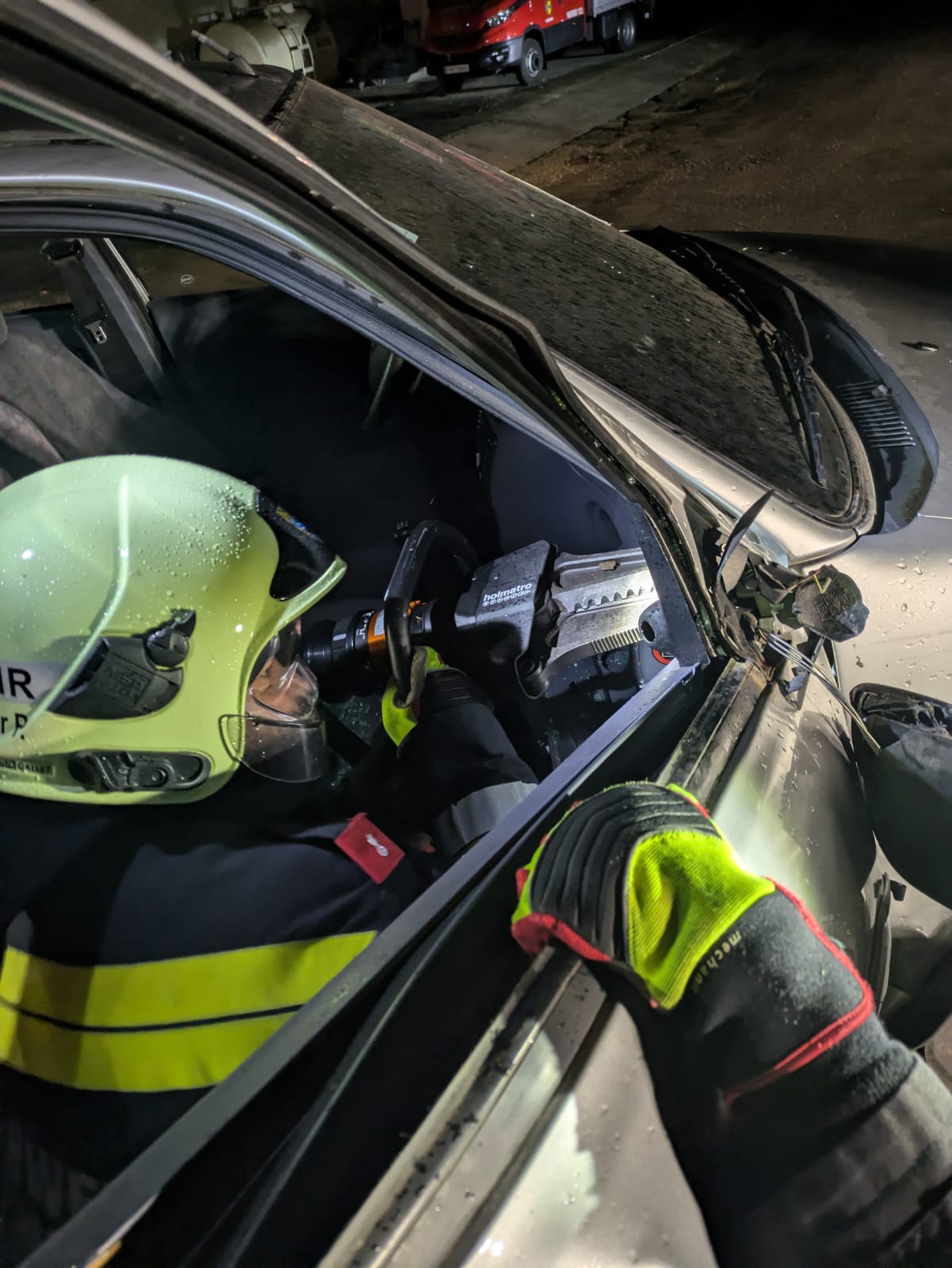 Annahme VU mit einer eingeklemmten Person im PKW und einer weiteren Person unter einem schweren I-Träger Gestell. Retten beider Personen mittels Kombi Spreitzer und Spineboard.