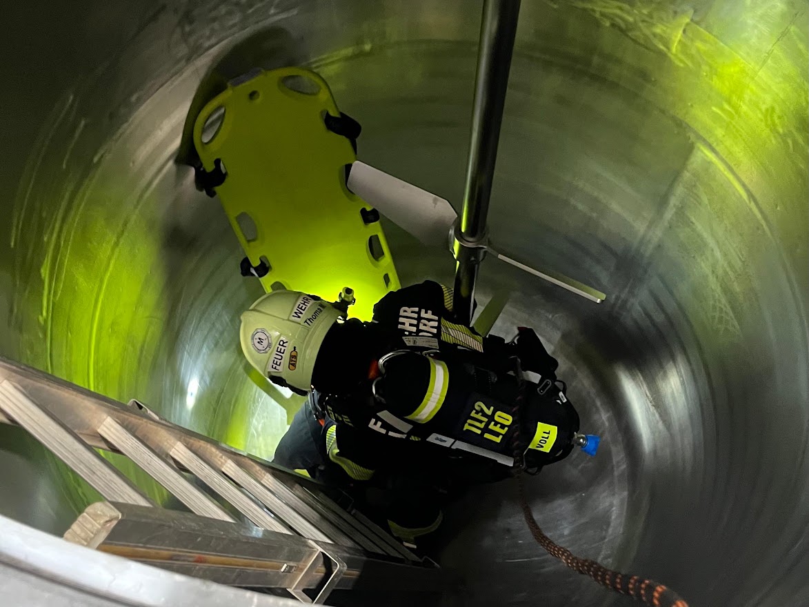 Die Feuerwehr hatte die Aufgabe, zu demonstrieren, was passieren kann, wenn es bei Reinigungsarbeiten an großen Behältern zu einem Unfall kommt – und wie man solchen Situationen vorbeugen kann.