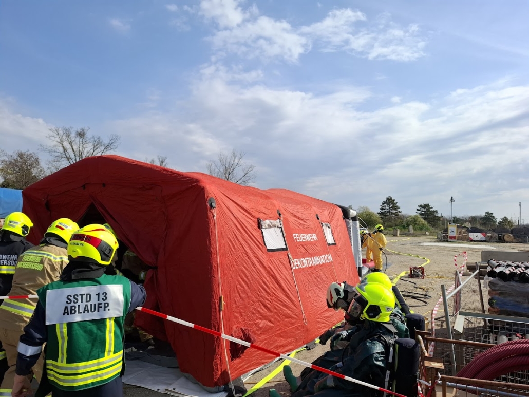 Die Schadstoffzüge aus den Bezirken Mistelbach und Korneuburg trafen in weiterer Folge ein und errichteten zwei voll funktionsfähige Dekontaminationsstraßen, um Einsatzkräfte und Material dekontaminieren zu können.