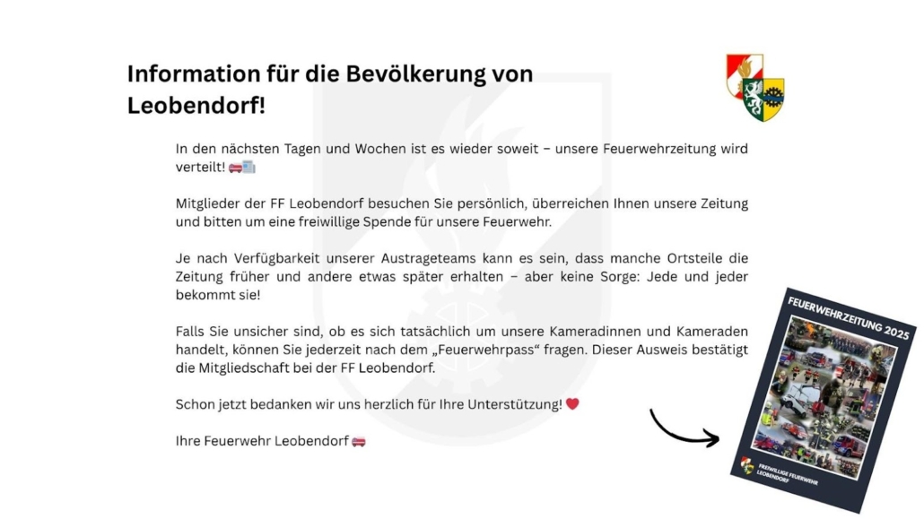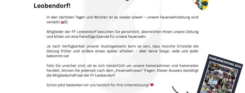 In den nächsten Tagen und Wochen sind Mitglieder der FF-Leobendorf unterwegs, um die Feuerwehrzeitung auszutragen.